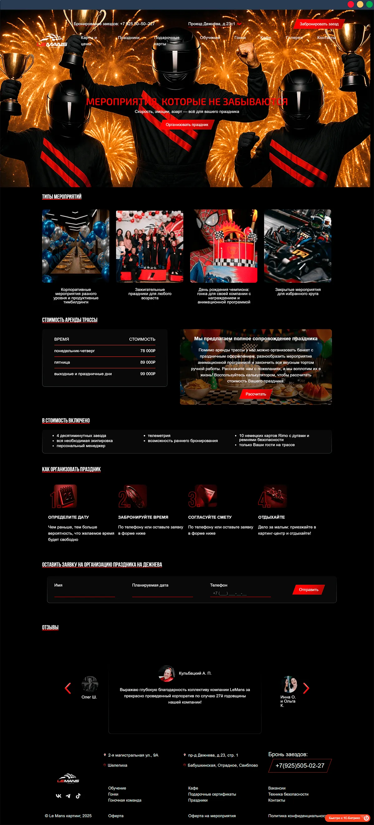 Le Mans Karting – картинг-центр, предлагающий аренду трассы, заезды и проведение корпоративных мероприятий. Компания ориентирована на частных клиентов и бизнес-аудиторию, для которых важны удобство бронирования, понятная подача услуг и современный формат взаимодействия с сайтом. При работе над проектом мы учитывали развлекательную специфику бизнеса и необходимость быстро вовлекать пользователя и подводить его к записи.